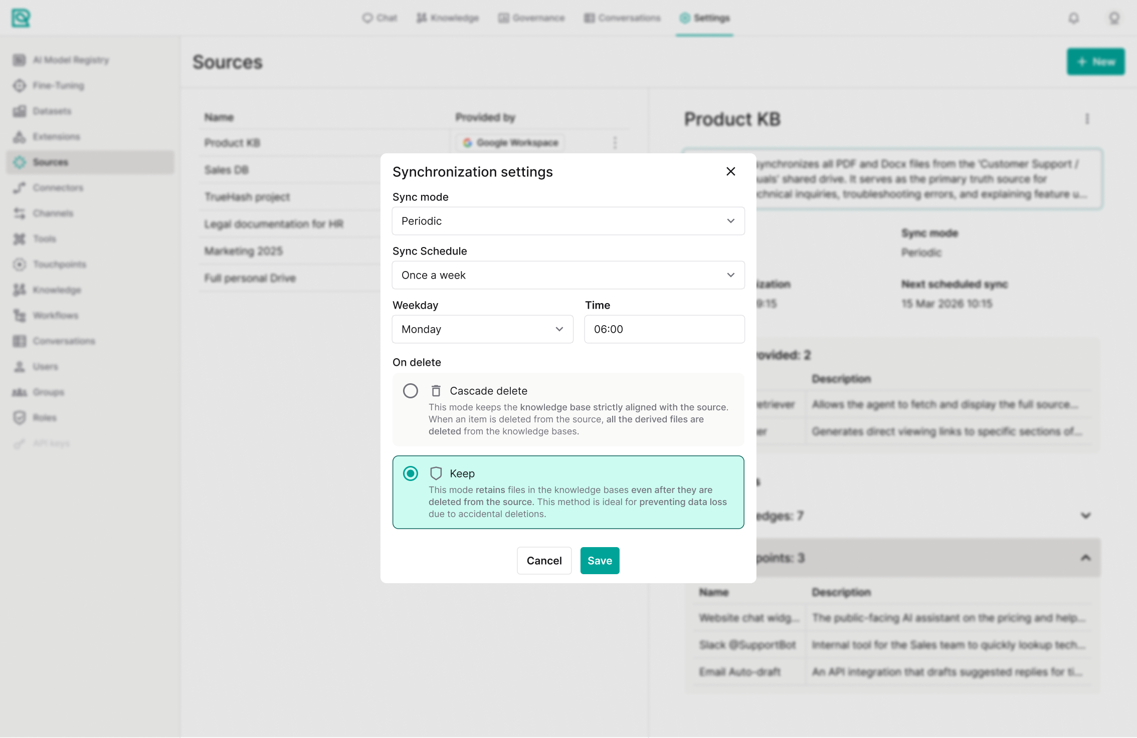 • Cascade delete: files deleted from the original source (e.g., from Google Drive) are also removed from the Rational AI.
